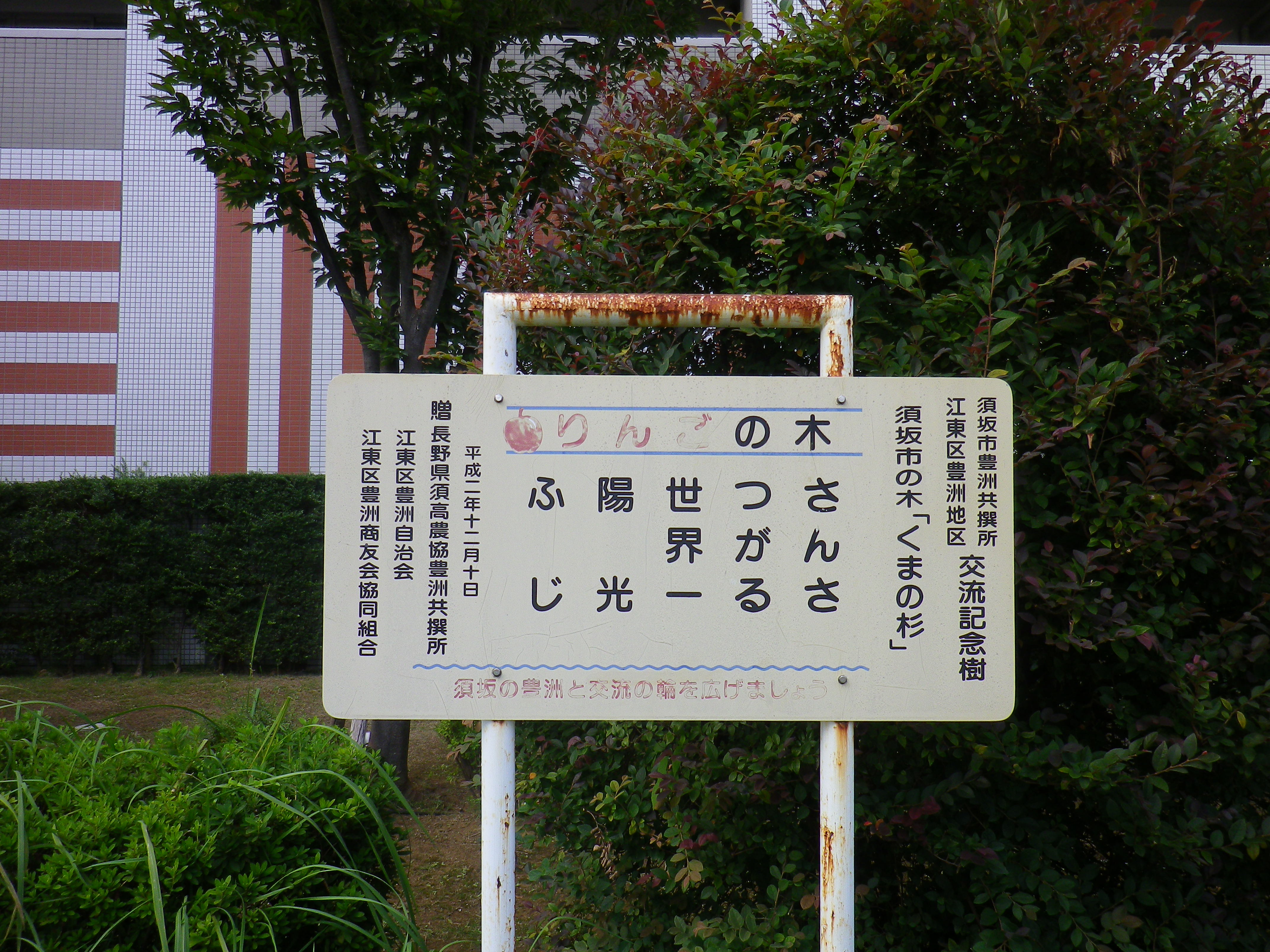 長野県須坂市と豊洲との交流記念樹がありました。
