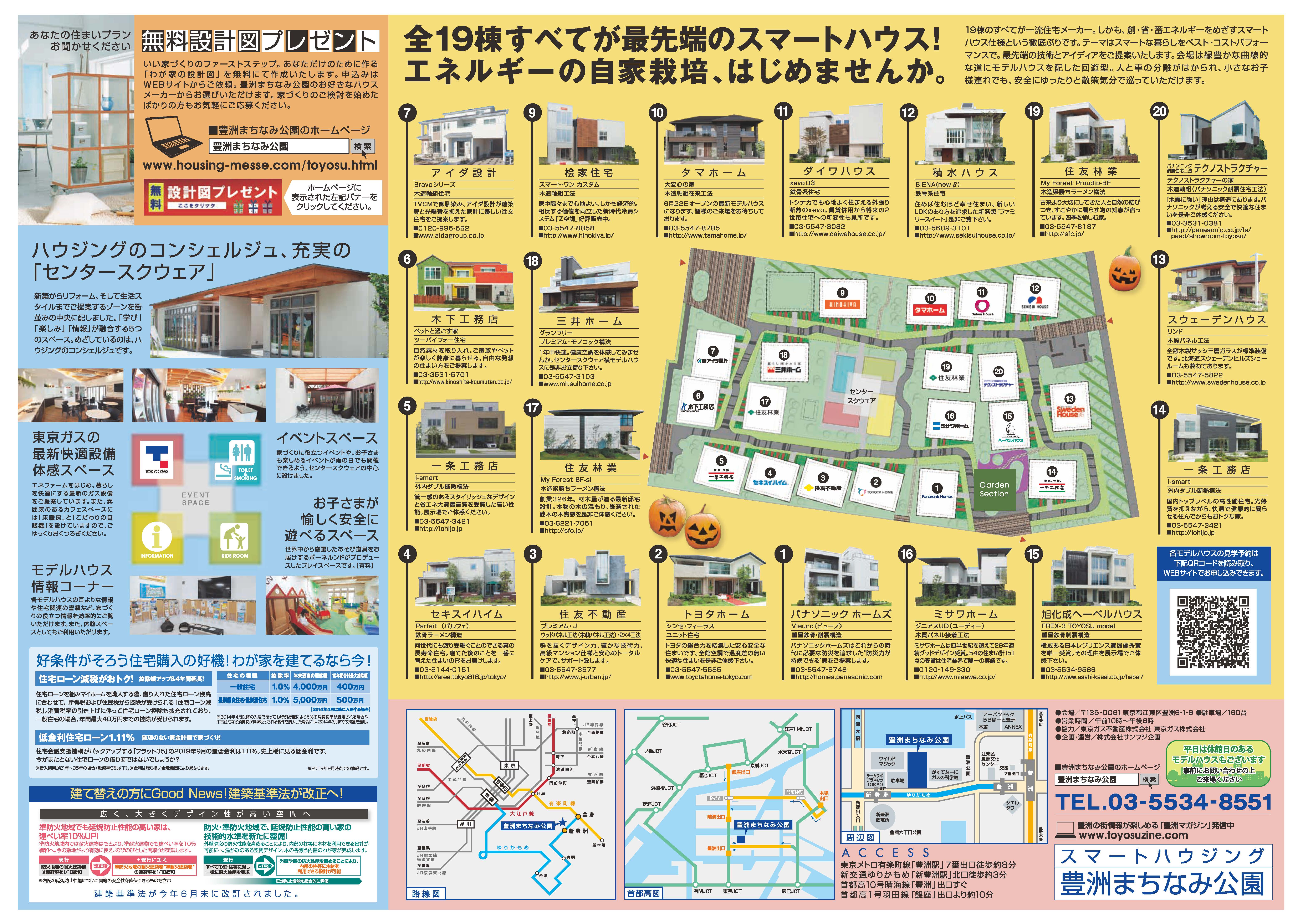 スマートハウジング 豊洲まちなみ公園 東京都江東区豊洲6-1-9 TEL:03-5534-8551 【お車でお越しの方】 首都高10号晴海線「豊洲」出口よりすぐ 首都高1号羽田線「銀座」出口より10分 無料駐車場 約100台 【電車でお越しの方】 東京メトロ有楽町線「豊洲駅」7番出口徒歩約8分 新交通ゆりかもめ「新豊洲駅」北口徒歩約3分 ※センタースクウェアは、豊洲まちなみ公園の中にあります。