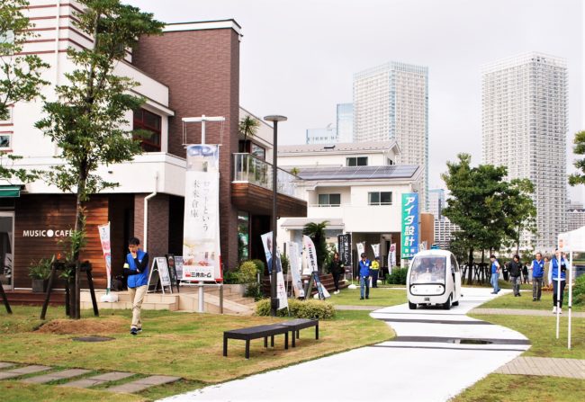 そして、豊洲まちなみ公園ではこの日も、清水建設㈱による自動運転車両試乗走行・歩行者ナビ連携体験が開催されました。