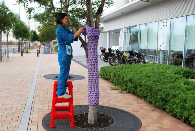 まず、目に入って来たのが、街路樹の幹に巻かれた紫色のニット。