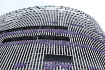 そして、何気なく上空を見上げると、東京ガス豊洲スマートエネルギーセンターの外壁の一部にもニットが!
