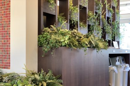 入口を入ってすぐ、都会のオアシスのような緑が溢れるセルフカフェコーナー。