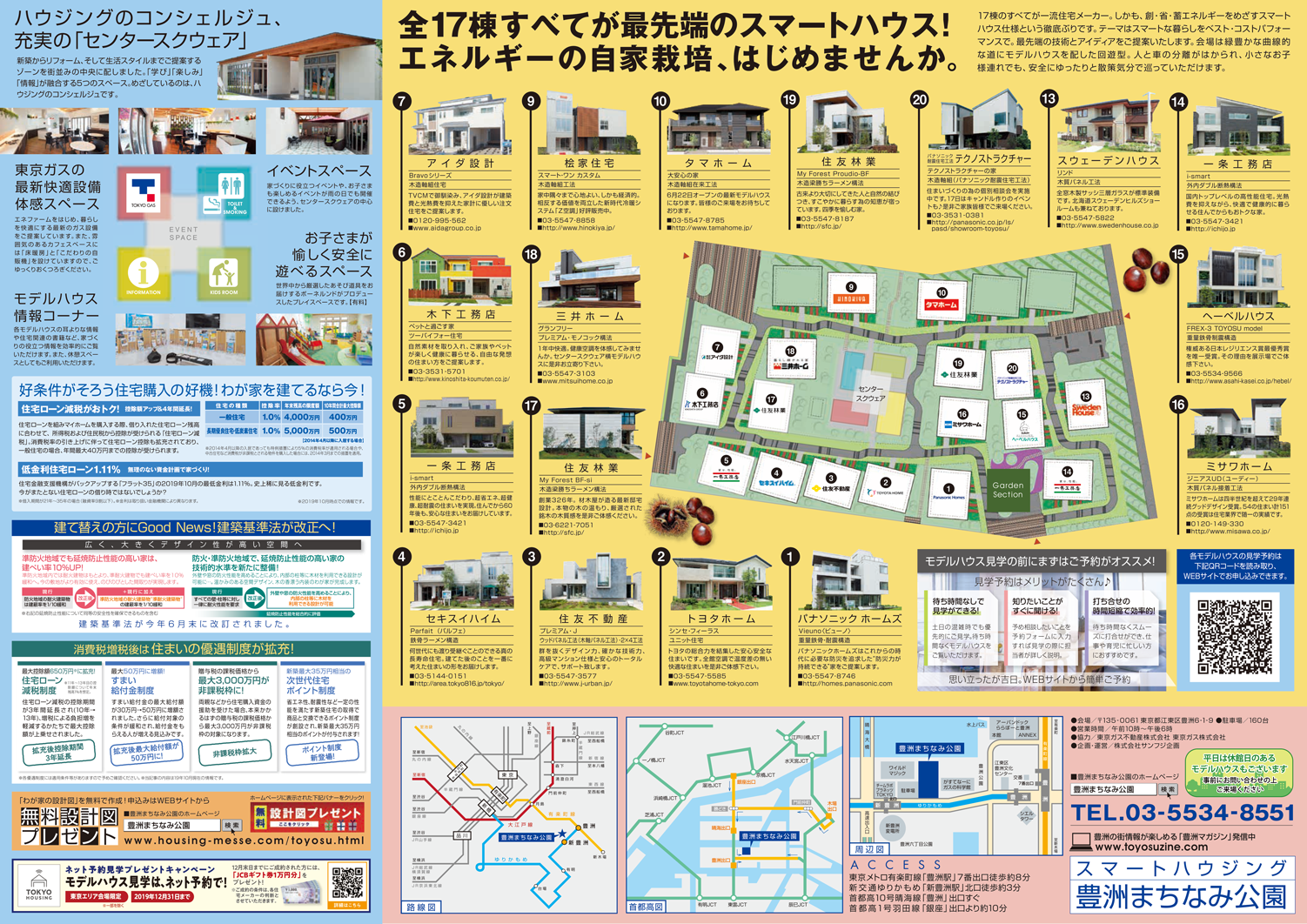 スマートハウジング 豊洲まちなみ公園 東京都江東区豊洲6-1-9 TEL:03-5534-8551 【お車でお越しの方】 首都高10号晴海線「豊洲」出口よりすぐ 首都高1号羽田線「銀座」出口より10分 無料駐車場 約100台 【電車でお越しの方】 東京メトロ有楽町線「豊洲駅」7番出口徒歩約8分 新交通ゆりかもめ「新豊洲駅」北口徒歩約3分 ※センタースクウェアは、豊洲まちなみ公園の中にあります。