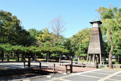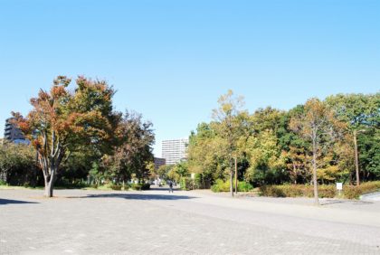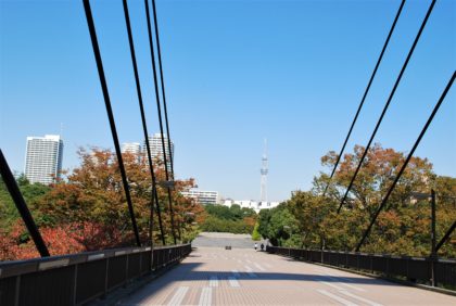 「木場公園」は総面積24.2ヘクタールの広大な公園です。公園は、大きく二つのエリアに分かれています。この二つのエリアを結ぶ木場公園大橋の真ん中からスカイツリーが望めました。周囲の樹木はかなり色付きが進んでいます。