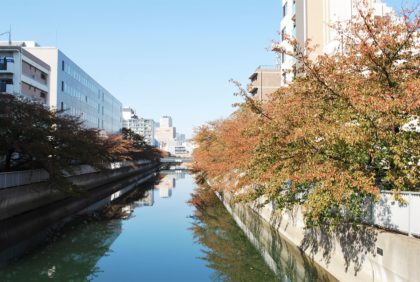 ここは、仙台堀川の海辺橋からの眺めです。赤の色付きが水面にも映っています。仙台堀川の両サイドはウォーキングコースとして遊歩道が整備されています。この水辺橋から目と鼻の先に「清澄庭園」があります。この庭園に隣接するのが「清澄公園」です。