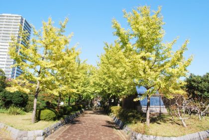 「豊洲公園」の入り口の並木がだいぶ黄色くなっていました。午後3時を過ぎると太陽が西に傾き、逆光が並木に重なって、黄色い葉っぱがキラキラと煌めきます。