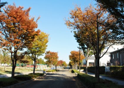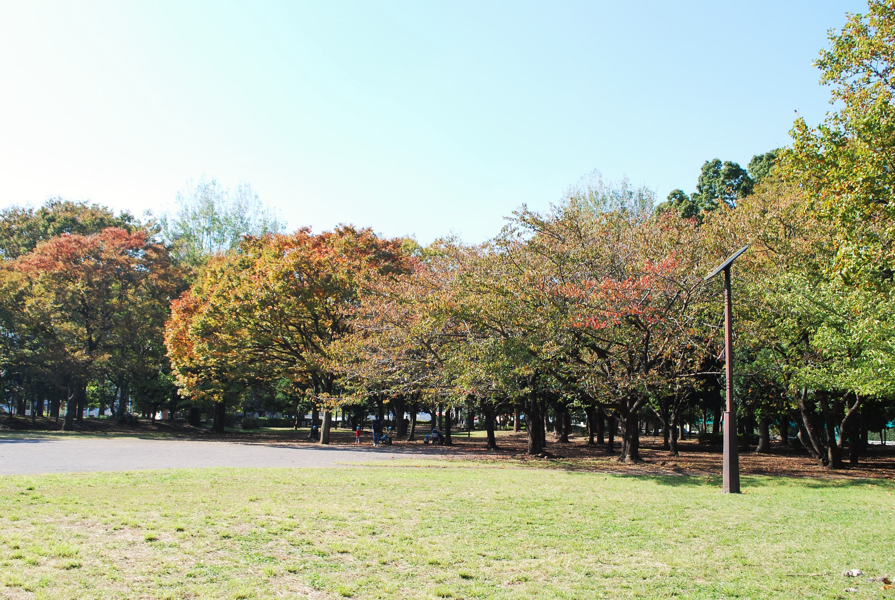 広場は、赤と茶に色づき始めています。一部に残った緑とのコントラストが素敵です。