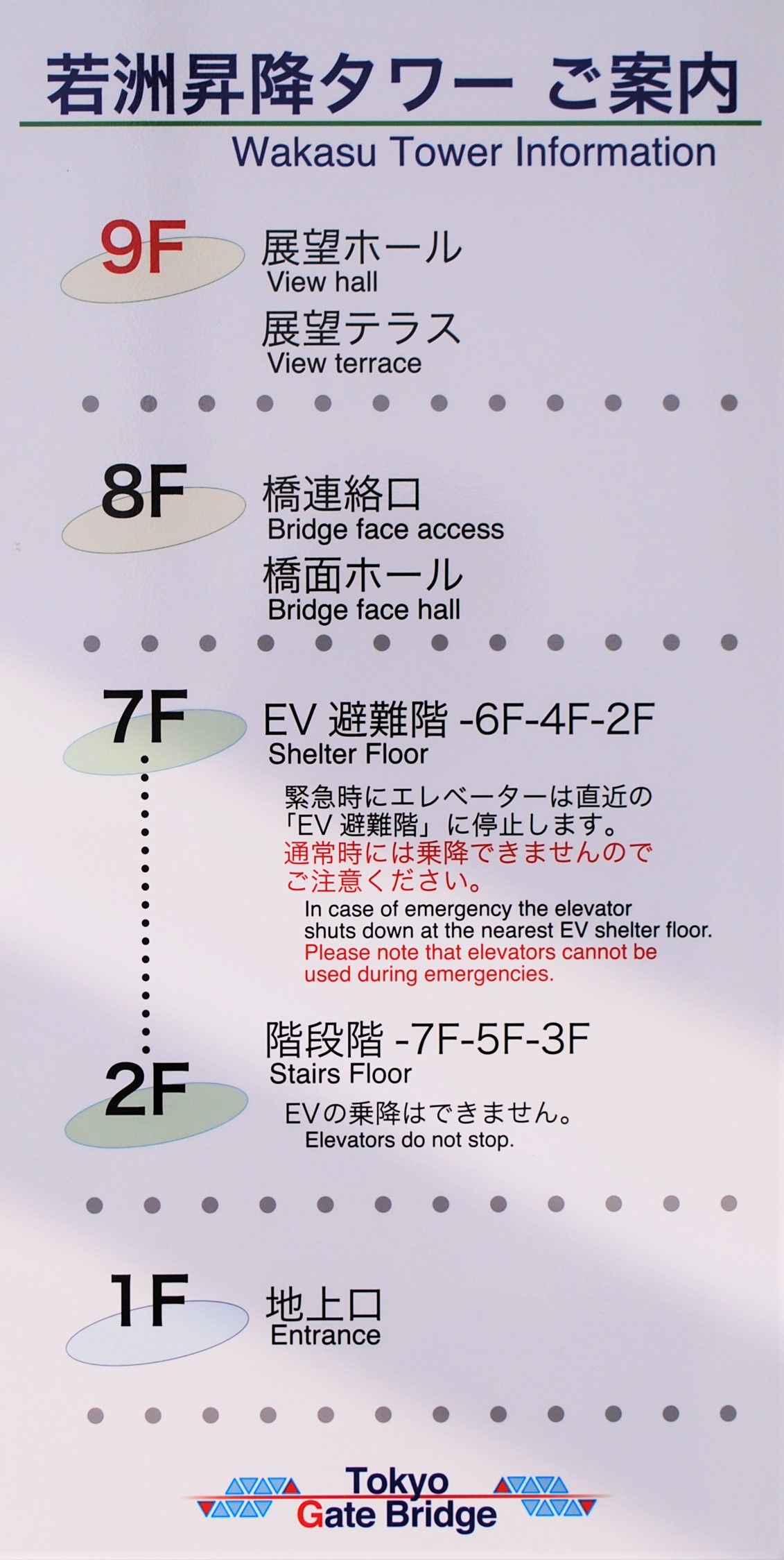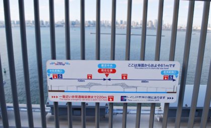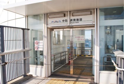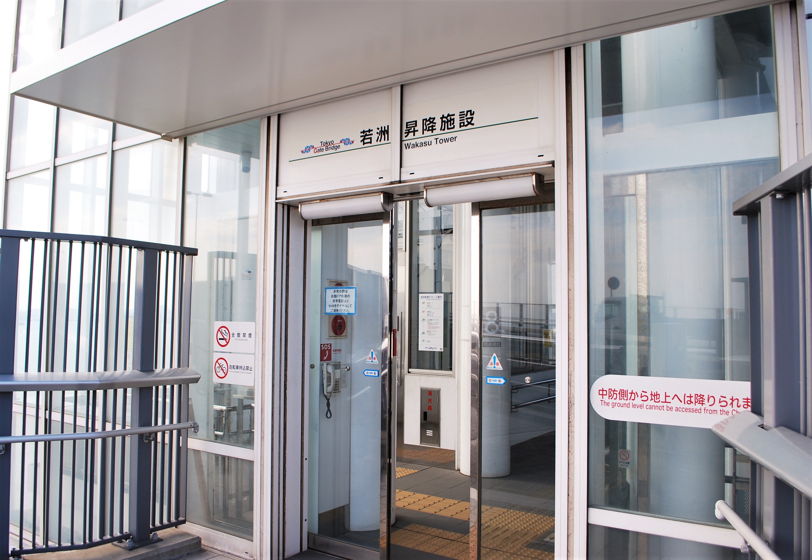 「東京ゲートブリッジ」の歩道へは、この昇降施設から向かうことになります。1階には警備員が待機していて、簡単な注意事項を説明してくれます。