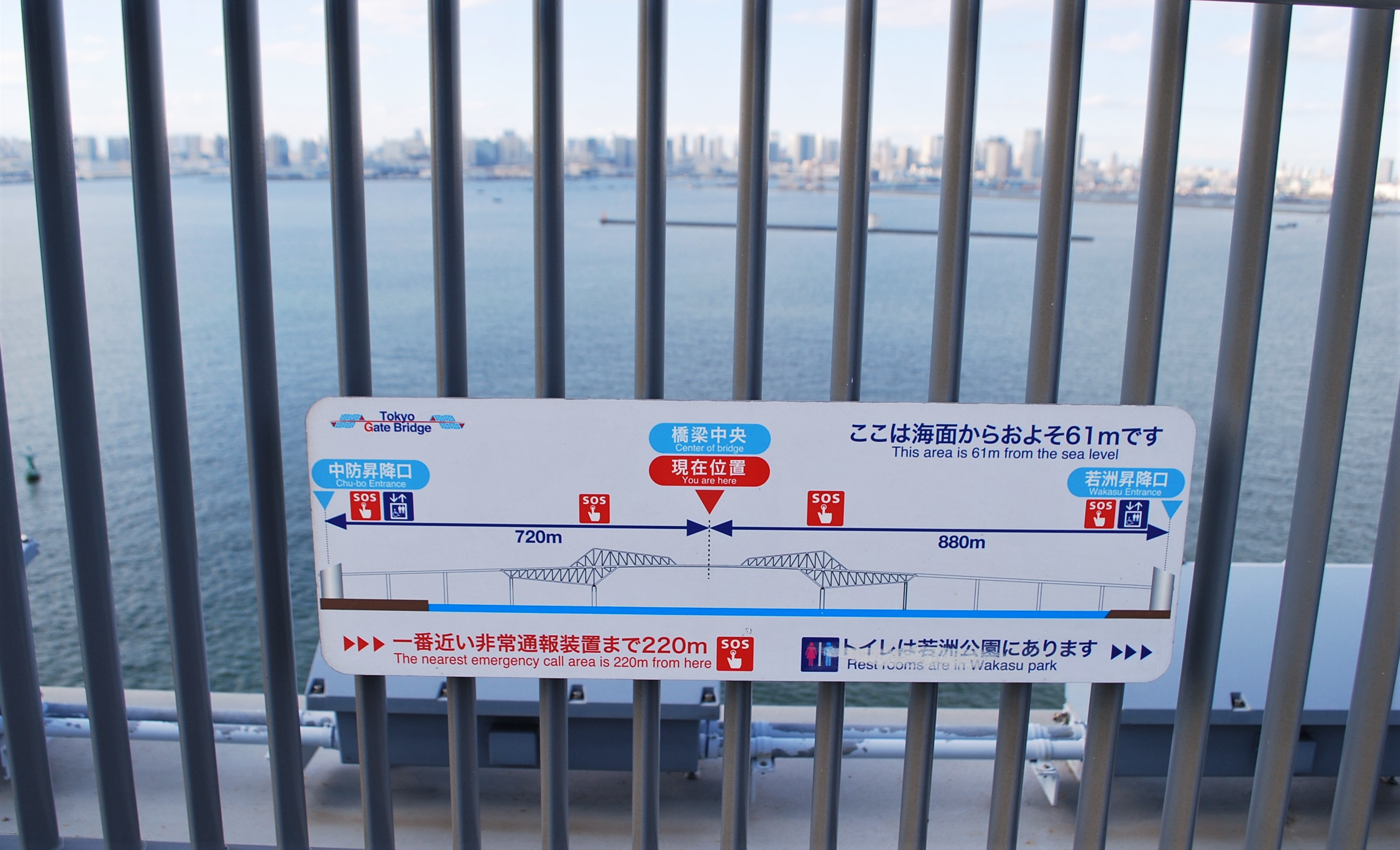 海面からおよそ61mとあります。対岸に豊洲、お台場、芝浦の高層ビル群が並んでいます。