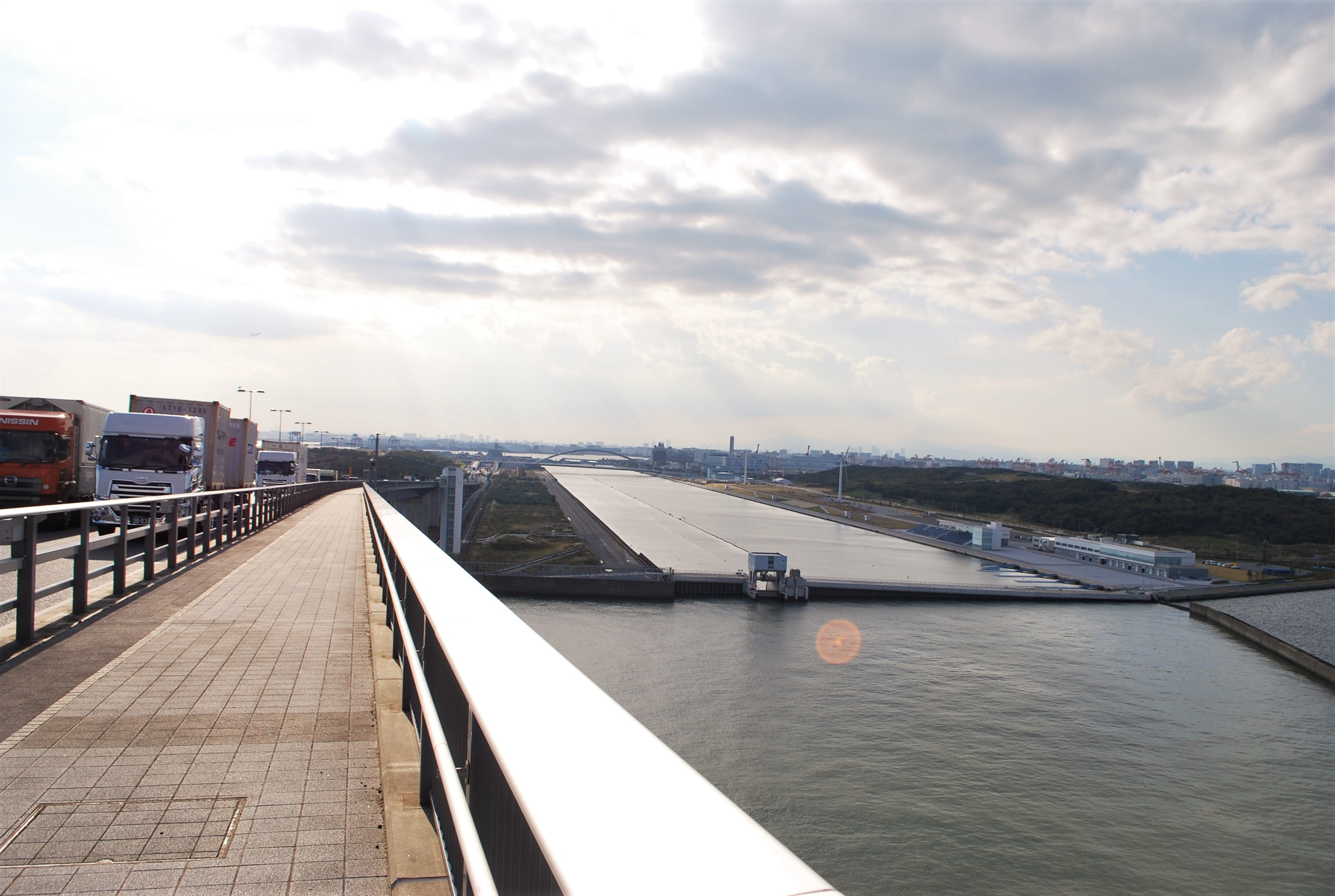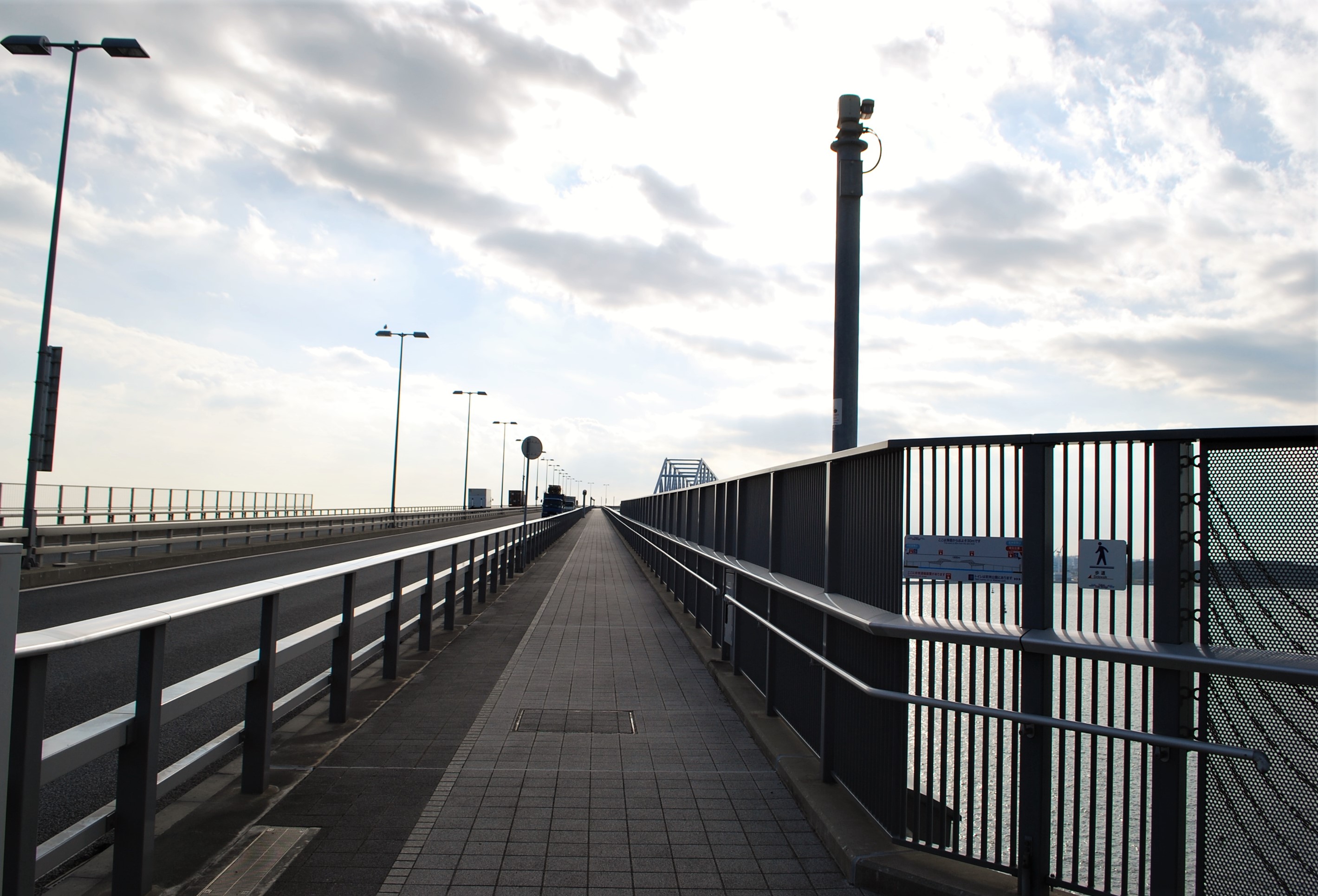 歩道のすぐ脇には、トラックや乗用車がビュンビュン通り過ぎてゆきます。海風も結構強く吹いていました。自然と早足になってしまいます。