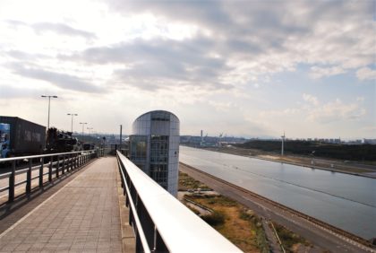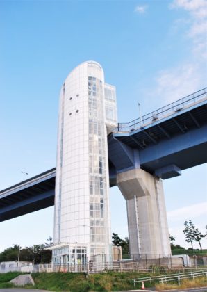 8階が橋の歩道への連絡口になっています。その上の9階は展望テラスとなっていて、周囲の景色を楽しむことができます。1階から9階までは階段でも上り下りができますが、今回はエレベーターで上がることにしました。