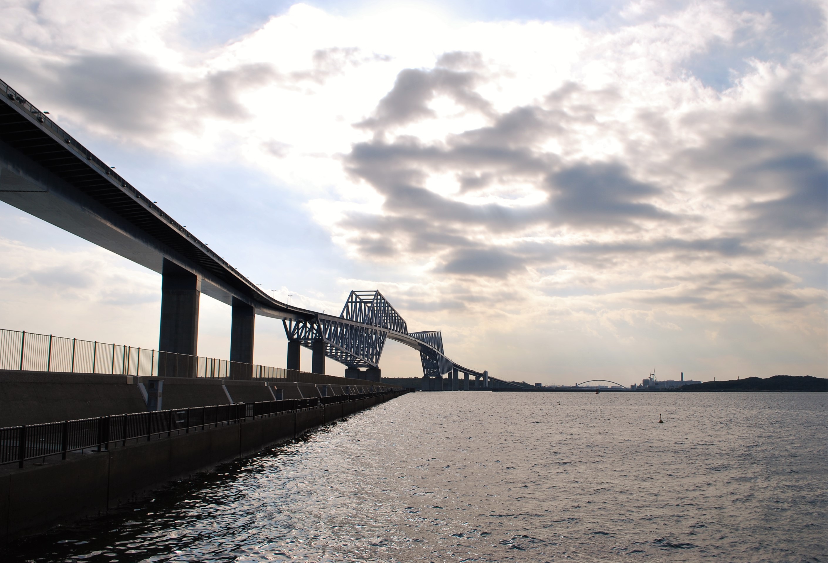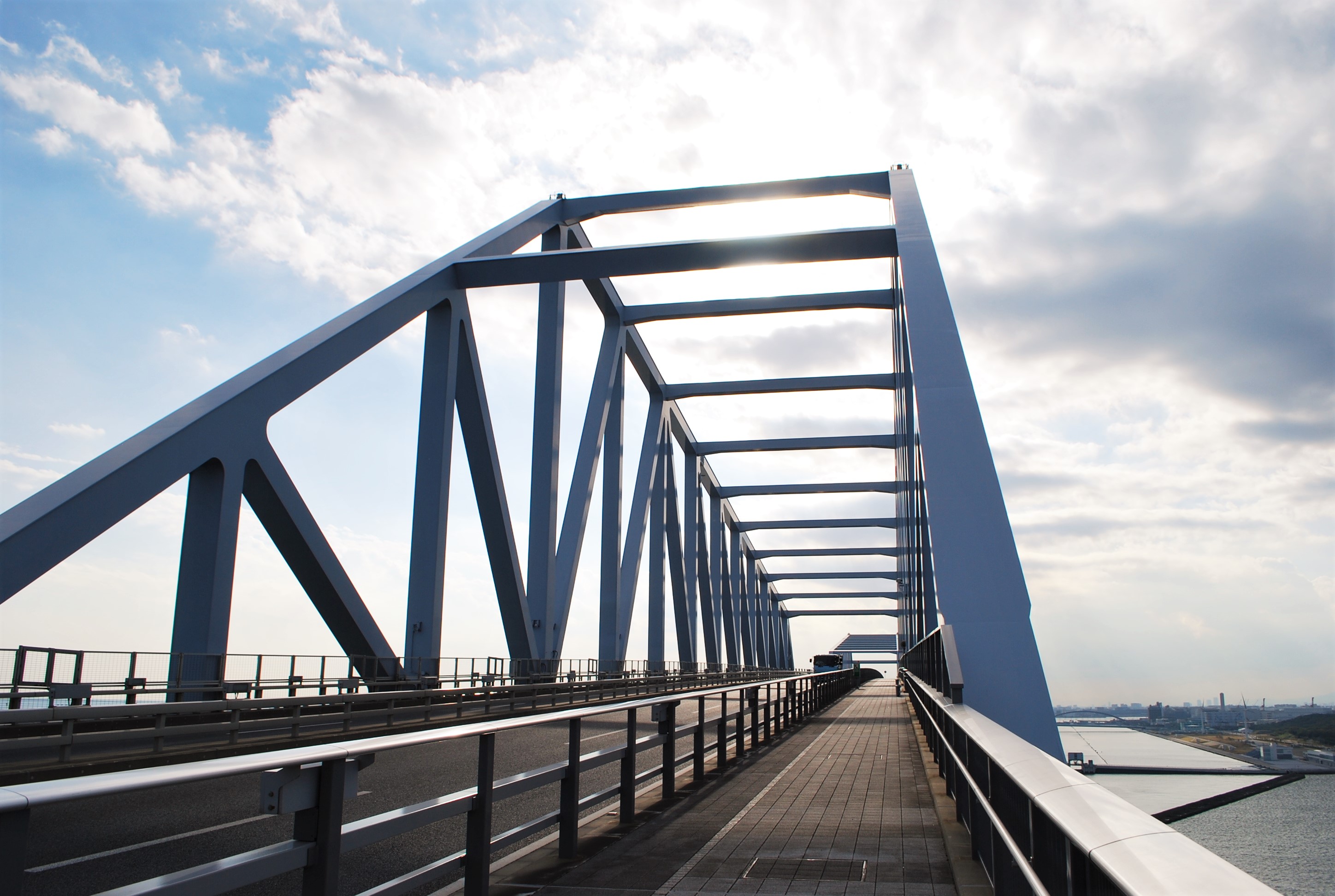 「東京ゲートブリッジ」は、建設地が羽田空港に近く航空機の飛行ルート上にあるため、航空法により橋の高さに制限(98.1m以下)があり、また、東京東航路を通る大型船舶が航行可能な桁下の高さ54.6mを確保するために、三角形に繋いだ鋼材を組み合わせて橋桁の荷重を分散するトラス構造が採用されたそうです。