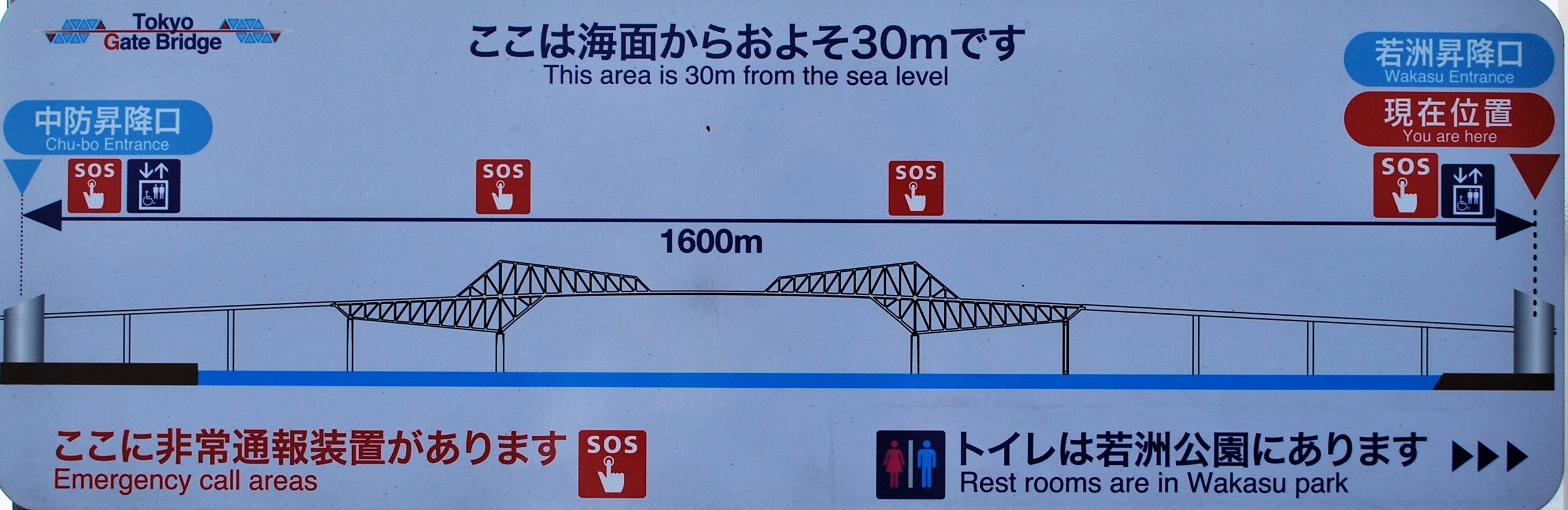 スタート地点に案内版があります。海面からはおよそ30mの高さ。中央防波堤の昇降施設までは1600mとあります。
