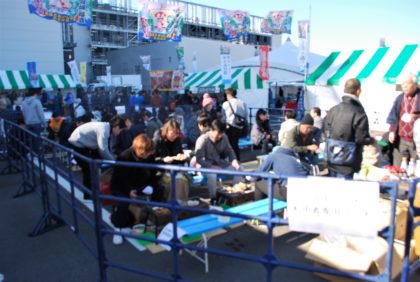炭焼きのコーナーでは、購入した食材を会場内で炭焼きにして食べることができます。この時間でも満席でした。