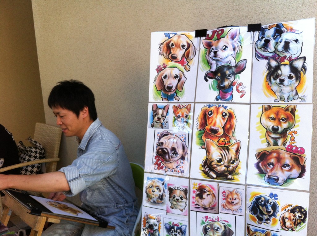 似顔絵作家さんがワンちゃんの特徴をさっと把握し、さらさらと似顔絵を色紙に描いて行きます。