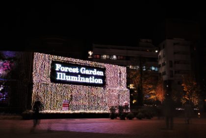 今年のテーマは「Forest Garden Illumination」。緑豊かな自然と優しい光のハーモニーが売りだそうです。入口の方を振り返ると、自然の樹木を活かした光のツリーのオブジェが見事です。水のモニュメントも7色に変化して幻想的な世界が広がっています。