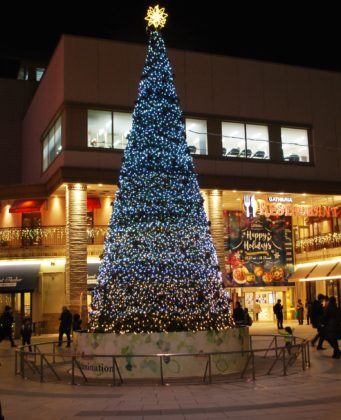 そして、最高の見ごたえは、10mのクリスマスツリー!電球色と白色LEDのコンビネーションの光の色が音楽に合わせて、変化します。こちらのクリスマスツリーの点灯は12月25日まで。