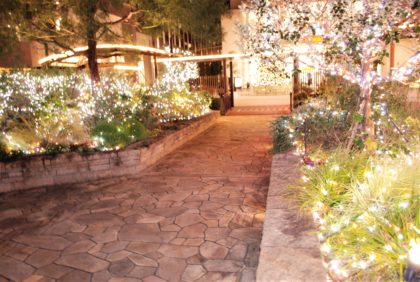 さらに、ガーデンコートには光のアベニューが伸びています。こちらでは、ランタンの揺らめく明かりやグローブ球の自然な光が優しく、緑を包み込んでいました。