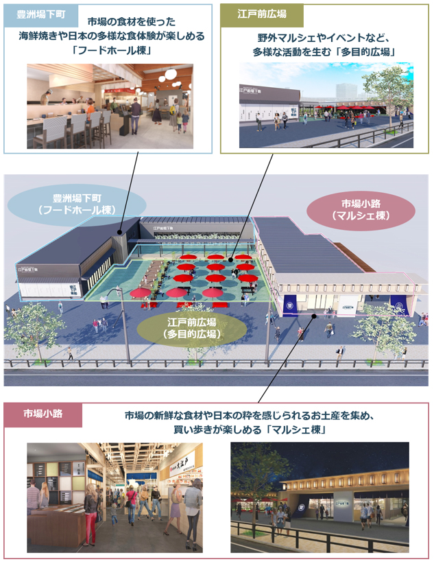 本施設は、市場の食材を使った海鮮焼きや日本の多様な食体験が楽しめる「豊洲場下町(フードホール棟)」、市場の新鮮な食材や日本の粋を感じることができるお土産を集め、買い歩きが楽しめる「市場小路(マルシェ棟)」、屋外マルシェやイベントなど様々な方が集い憩うことができる「江戸前広場(多目的広場)」の3つのゾーンから構成されます。