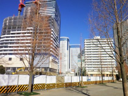 今年の4月24日にオープンが決定した「豊洲ベイサイドクロス」。この商業施設と豊洲公園を結ぶ橋が「サンセットクロス」です。橋の工事の周辺は高い養生壁で囲まれていましたが、つい先日、養生壁が取り除かれ、橋の様子が露わになりました。工事はまだ続きますが、豊洲公園から豊洲駅までの新たな架け橋が出来上がるのが楽しみです。
