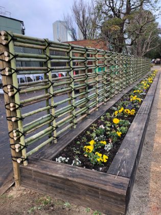 そして、遊具広場じゃぶじゃぶ池の隣では、枕木と竹を使った花壇も完成しました。
