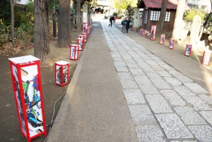 誘導看板から5分程で、香取神社の境内に到着。参道には、珍しい灯籠が並んでいます。これは、スポーツ灯籠です。亀戸香取神社は今年でご鎮座1350年を迎えます。これを節目に「スポーツ燈籠會(え)プロジェクト」を開始したそうですす。このプロジェクトは、勝利に向けて挑むアスリートの「言葉」の強いパワーを、燈籠に書き込むことで、そのあかりを守り、皆様の活躍をご祈念しようというプロジェクト。亀戸香取神社の御祭神は、経津主神(ふつぬしのかみ)です。こちらの神様は、鹿島大神と共に豊葦原瑞穂国(日本国)の平定に手柄を立てられた威霊優れた国家鎮護の神として仰がれ、武将の祖神だそうです。これがスポーツ振興の神の由縁なのですね。詳しくは、亀戸香取神社のHPをご覧ください。