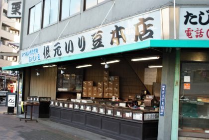 亀戸四丁目の交差点に古いお店がありました。「但元いり豆店」。こちらのお店は大正5年(1916年)創業の老舗です。店頭のケースに入ったいろんな種類の煎り豆を升で量り売りしています。