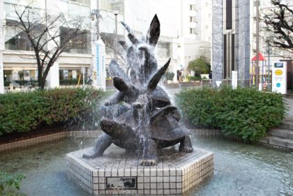 駅前の亀戸駅前公園。玄武が噴水の水を頭から被っています。結構な迫力ですね。玄武の詳しい情報は、「第三回江東区四神巡り」をご覧ください。神社巡りの1つ目は、亀戸天神社です。早速歩いてゆきましょう。蔵前橋通りに向かいます。