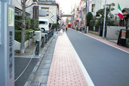 亀戸駅前公園から歩くこと10分。蔵前橋通りの「亀戸天神通り」に到着。『亀戸天神社は2つ目の信号が参道入口』とあります。途中、亀戸天神社東門入口がありますが、そこは素通りしてさらに歩いてゆきます。