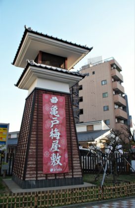 亀戸四丁目交差点には、「亀戸梅屋敷」もあります。こちらは、浮世絵師・歌川広重が描いたこともある江戸時代の亀戸に実在した梅屋敷。亀戸梅屋敷はその歴史ある建物をモチーフにして、観光案内所や物産店、江戸切子ギャラリー、寄席等、亀戸の文化、歴史の魅力をたっぷり味わえる複合商業施設です。