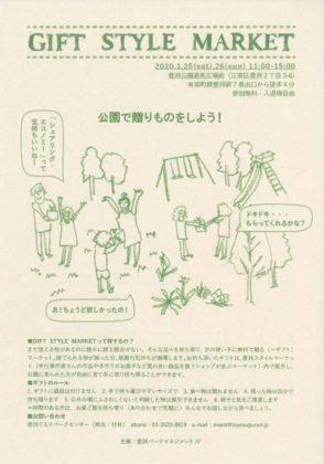 まだ使える物があるのに誰かに譲る機会がない。そんな品々を持ち寄り、次の使い手に無料で贈る(=ギフト)マーケット。捨てられる物が減った分、感謝の気持ちが循環します。値札の代わりにストーリーを書いた札を付けて、経年変化でできたキズなどもこの世に唯一の物語=価値(劣化ではない)として愛で受け継ごう。
