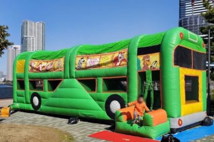 青空の中、たくさんのお子様がふわふわの中で跳ねたりすべったり。楽しんで行かれました。中でたくさんの動物に出会えたようです♪