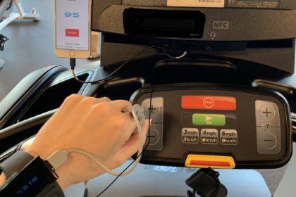 続いて有酸素系トレーニング。 血中酸素濃度と心拍数を測る機械を人差し指に装着し、ウォーキングマシーンへ。 平常時、私たちの血中酸素濃度はだいたい96〜7%。プロアスリートが全力を出して90%程度だそうです。