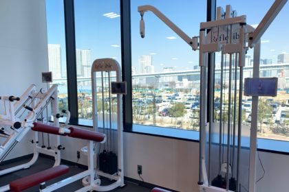 ストレングス系トレーニングエリア。ストレッチマシーンで肩甲骨の筋膜がパキパキと音を立ててはがれていくのがわかります…!5回ほど上げ下げしただけで肩周りがすっきり!空が見えて気分がいいです^^