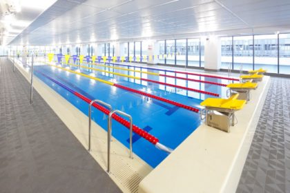 飛び込み台やトレーニング器具など、最新の設備が揃っています。水温も国際基準であるなど、水泳選手にとって試合本番さながらのプールです。