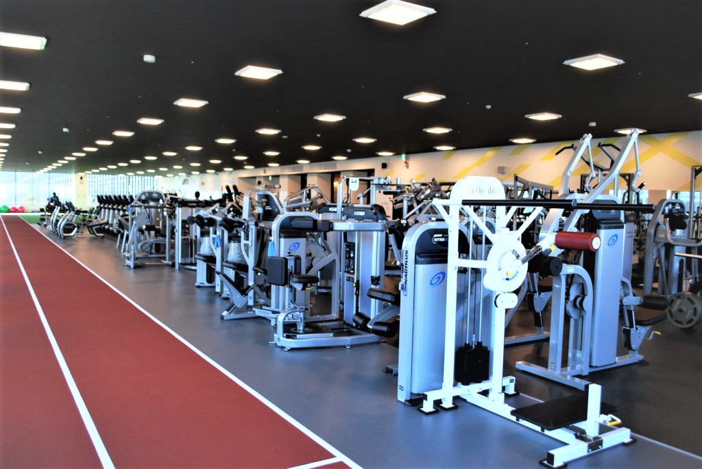 一方、同じ日のトレーニングルーム2の酸素濃度は標高2000メートル相当。(酸素濃度はスケジュールが組まれているのでチェックしてくださいね。)マシンエリアや人工芝エリアがあり、広く開放的な空間です。50メートルのランニングレーンは国際大会が行われるスタジアムと同じ素材なのだそう!