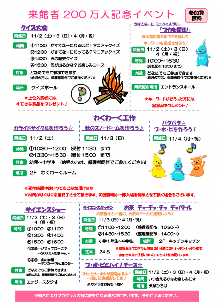 11月2(土)3(日)4(祝)の期間、みなさまへの感謝の気持ちを込めて「来館者200万人記念イベント」を開催します。