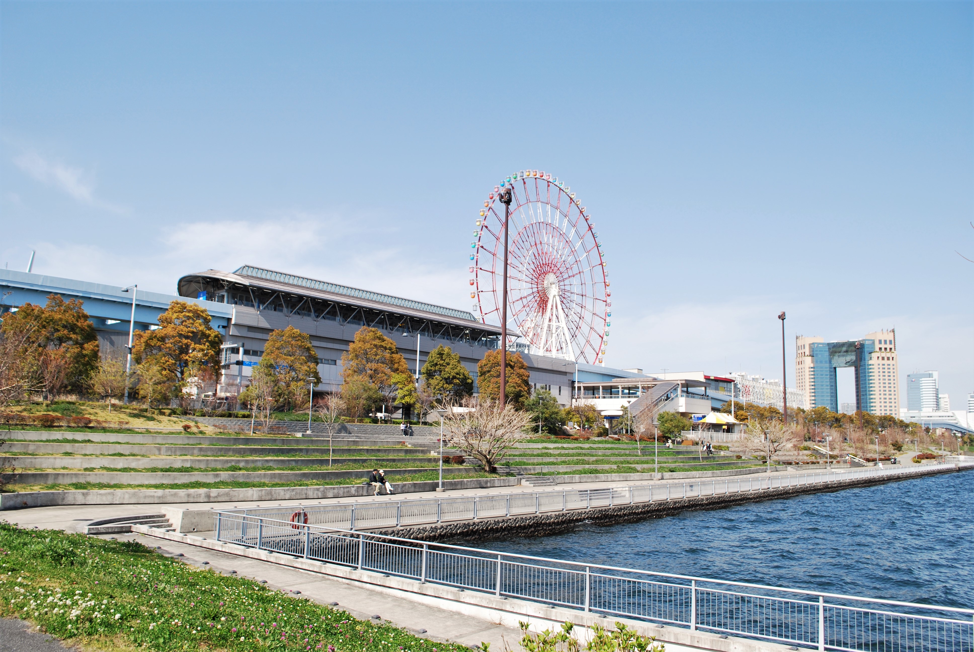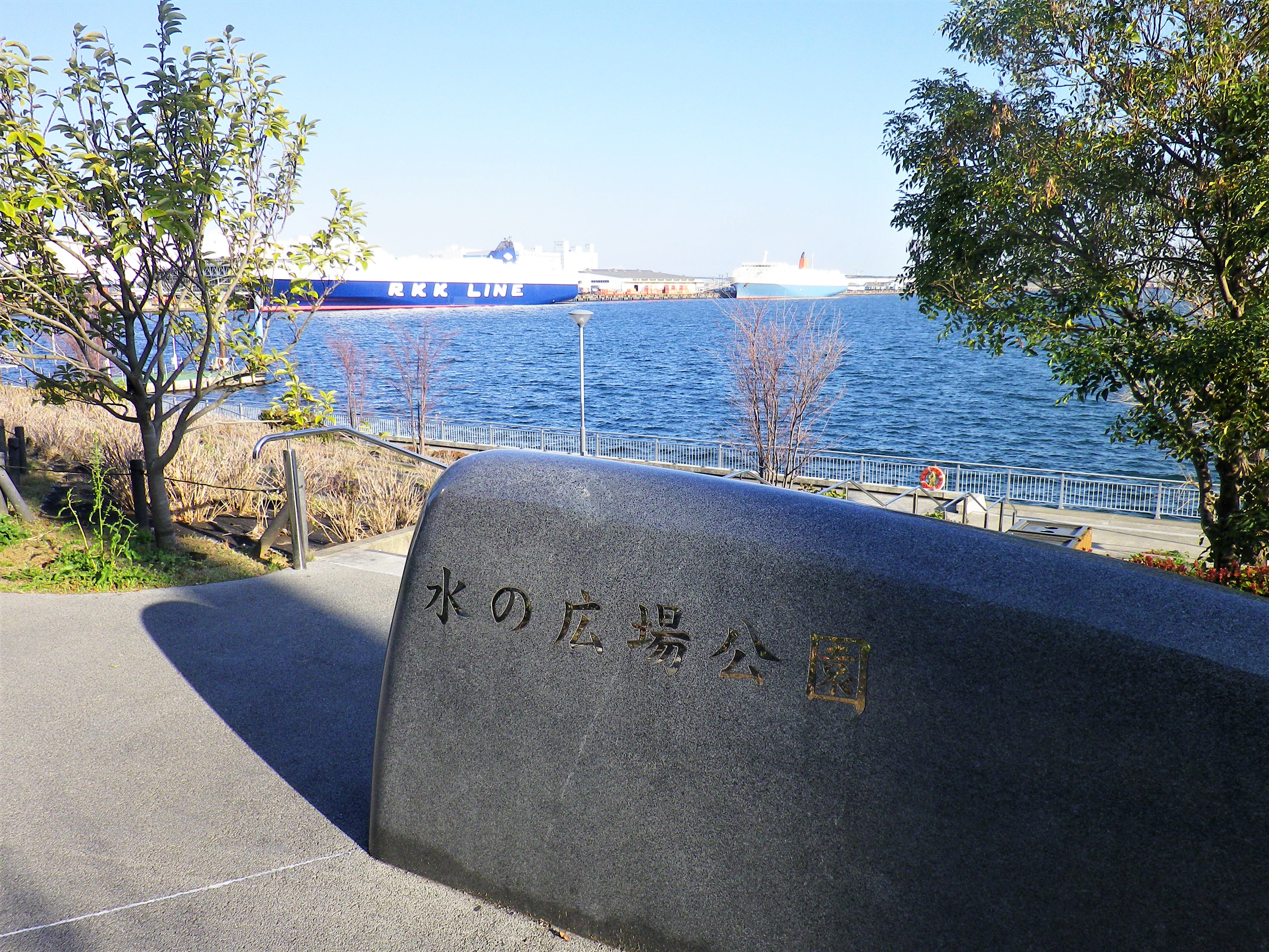 そのまま海の方向に向かって、階段を降りると「水の広場公園」に出ます。こちらは、静かな海辺のテラスになっていて、散歩や釣りなどが楽しめます。