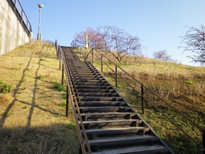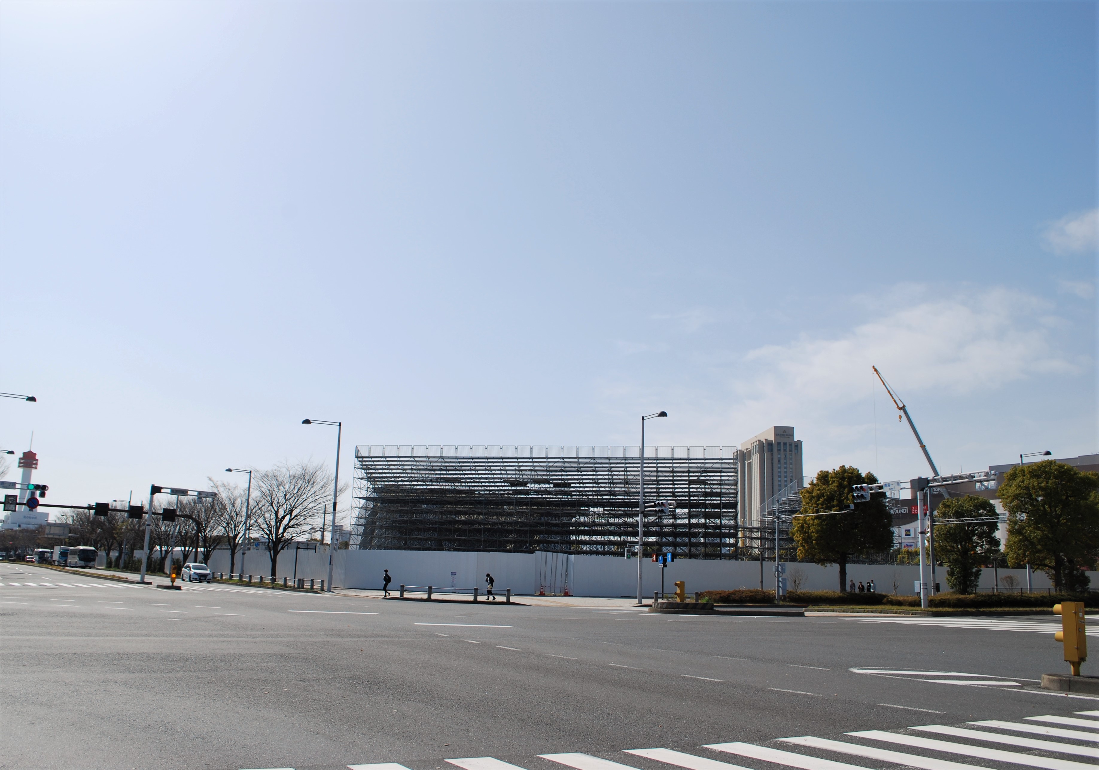 青海アーバンスポーツパークの工事現場をシンボルプロムナード公園側から眺めると、建築中のクライミングウォールが露わになりました。写真の右端に桜の蕾が。開花はまだ先のようです。