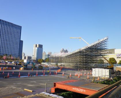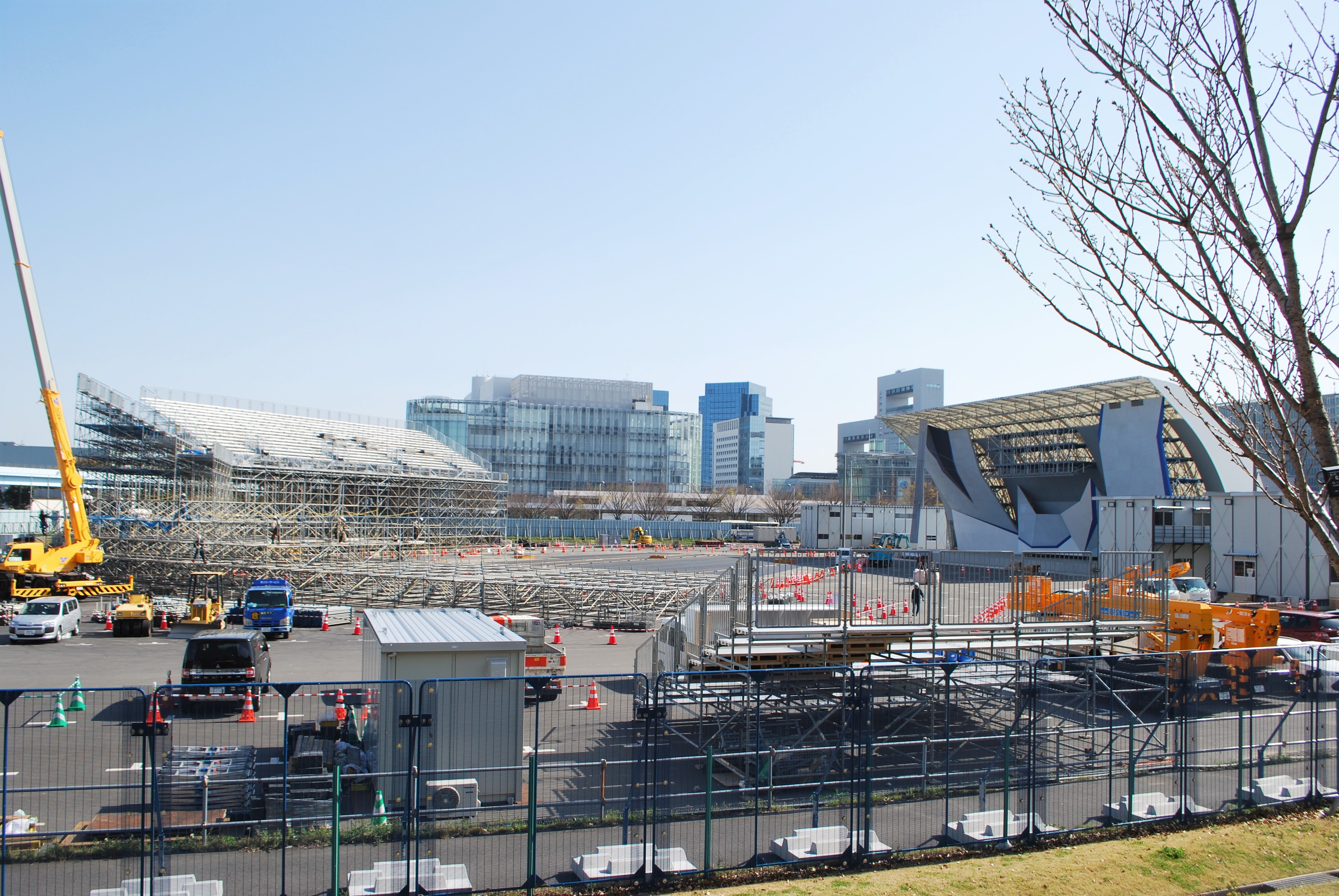 もう少し進んだところに工事現場の入り口がありました。観客席の骨組みが露わになりました。昨年7月25日に配信した「第四回オリンピック・パラリンピック会場へ行ってみた お台場編」の時点では、このエリアは真っ黒なアスファルトの駐車場でした。かなり様変わりしています。こちらでは、オリンピックは「バスケットボール(3×3 バスケットボール)」「スポーツクライミング」。