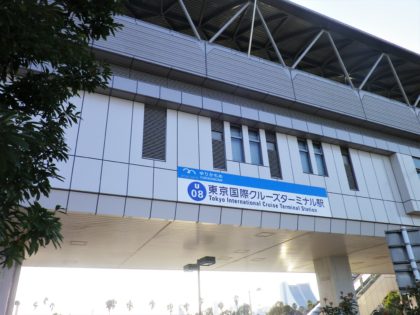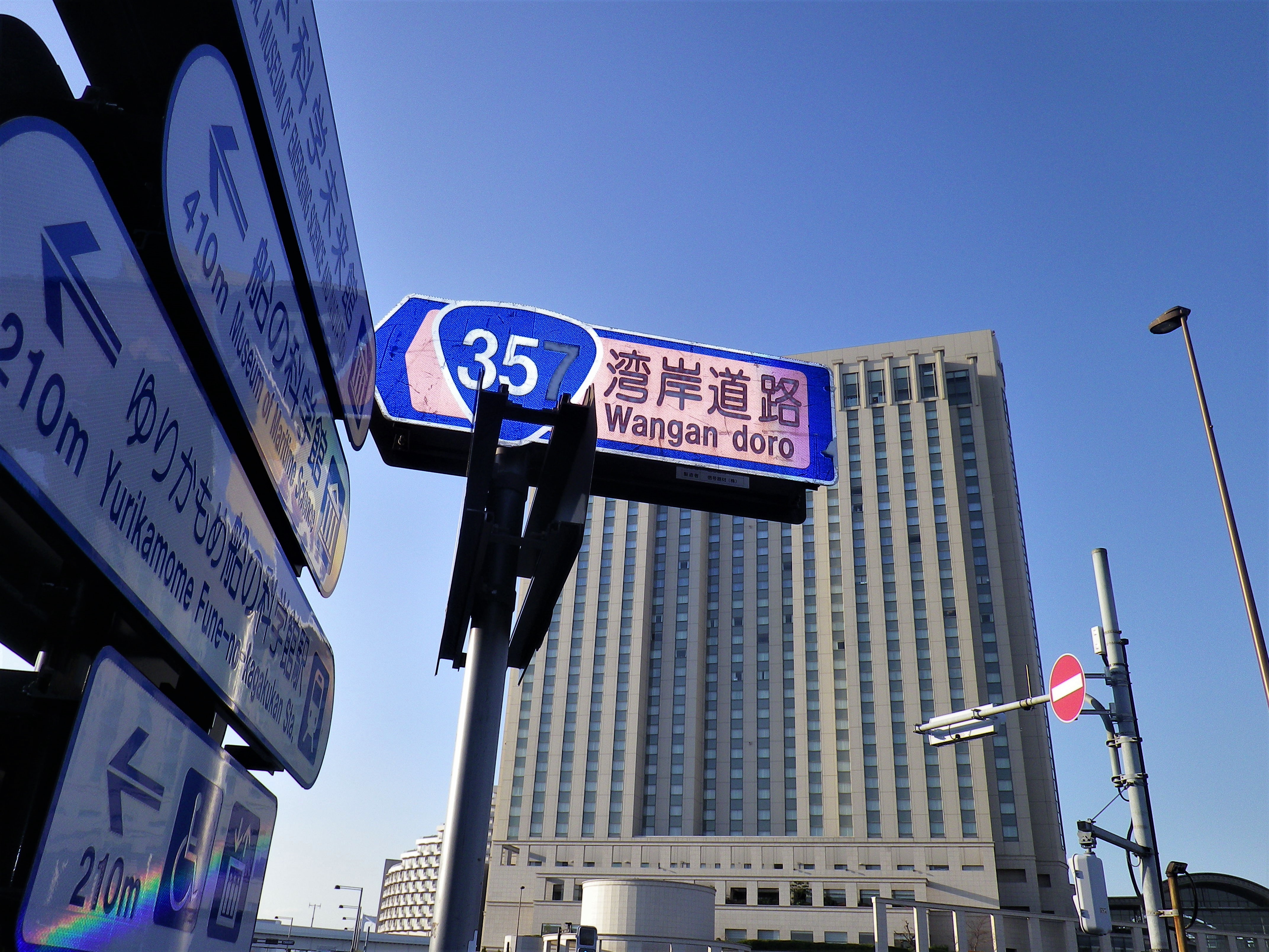 350mほど進むと「船の科学館入口」交差点まで来ました。おや?「国際クルーズターミナル駅」。2019年3月16日に現在の名称に変更になったようです。これは、今年の7月に「国際クルーズターミナル」が開業することと、既に「船の科学館」が一般公開を休止していることによる流れだそうです。ゆりかもめの「国際クルーズターミナル駅」を横目に見ながら国道357号線まで進んでゆきます。