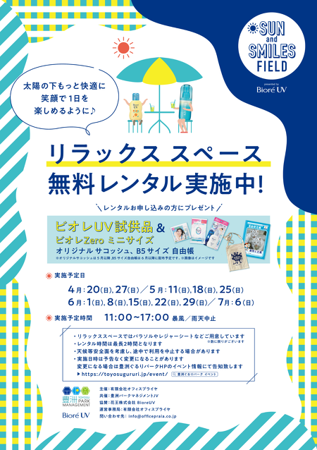 昨年春~夏も実施しご好評頂いたパラソルやレジャーシートなどの無料レンタルスペース「SUN and SMILES FIELD」を豊洲公園・芝生広場にて今年も期間限定で展開します!