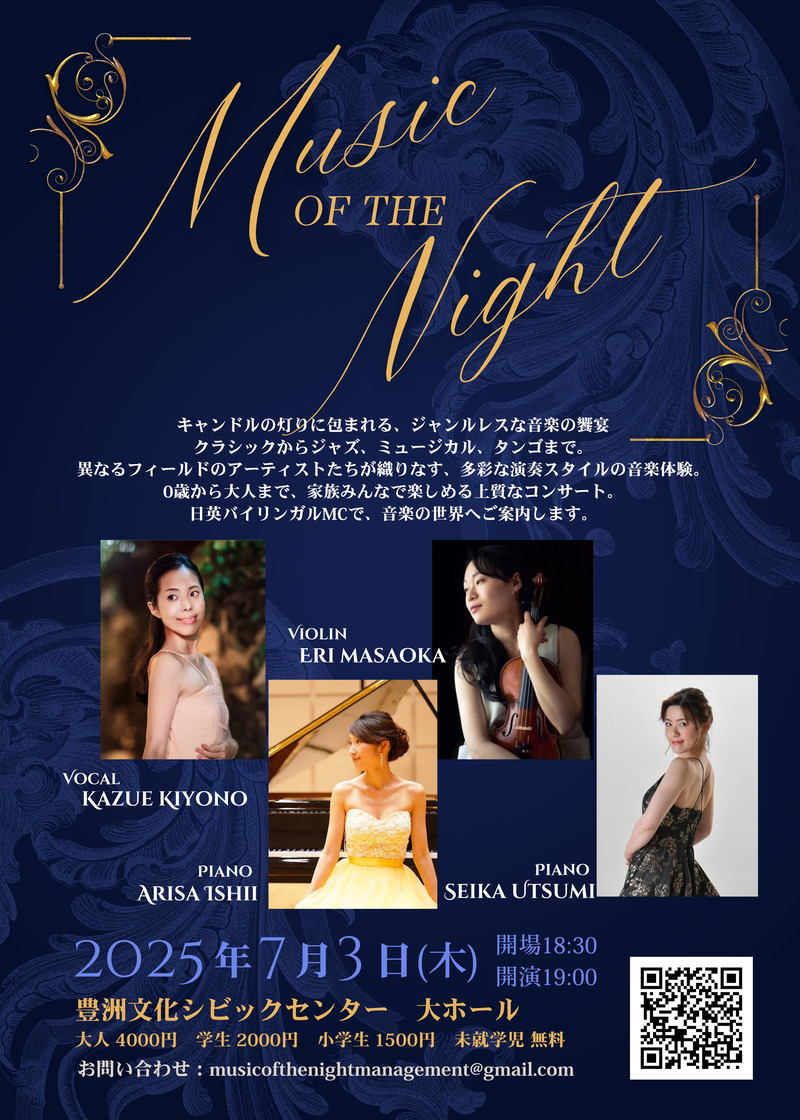 トップクラスの演奏家による多様な音楽ジャンルを楽しめるキャンドルライトコンサート「Music Of The Night」を2025年7月3日(木)に豊洲文化センター大ホールにて開催いたします。クラシック、ジャズ、ミュージカル、タンゴなど様々なジャンルを、ソロからアンサンブルまで多彩な演奏形態で届ける本公演は、0歳から入場可能で、日英バイリンガルでのMCも提供いたします。
