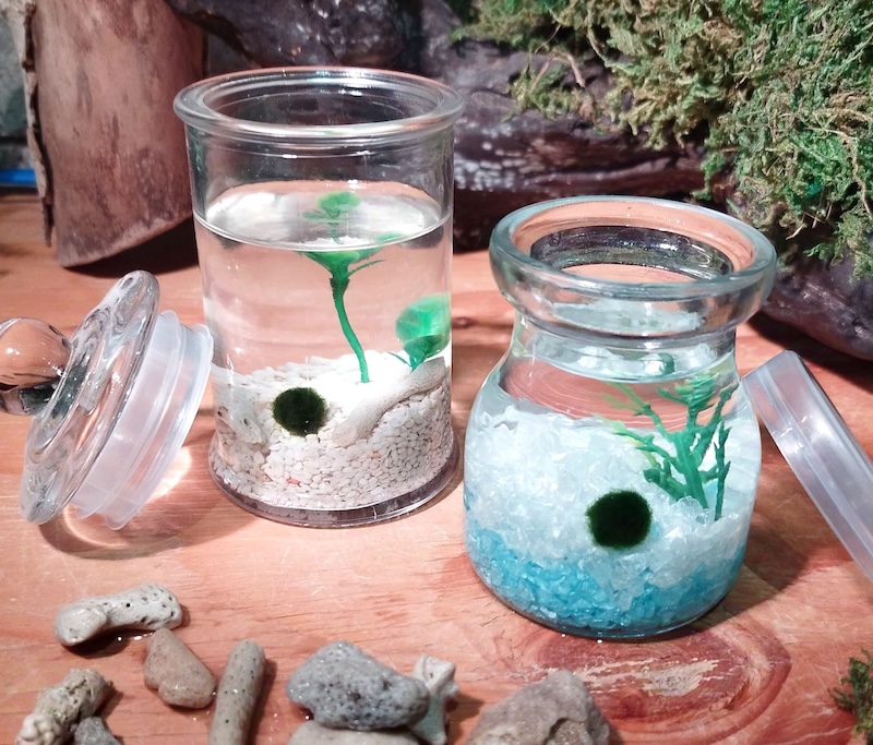 サンゴ砂と飾りを入れてマリモの住む小さな世界をつくろう。