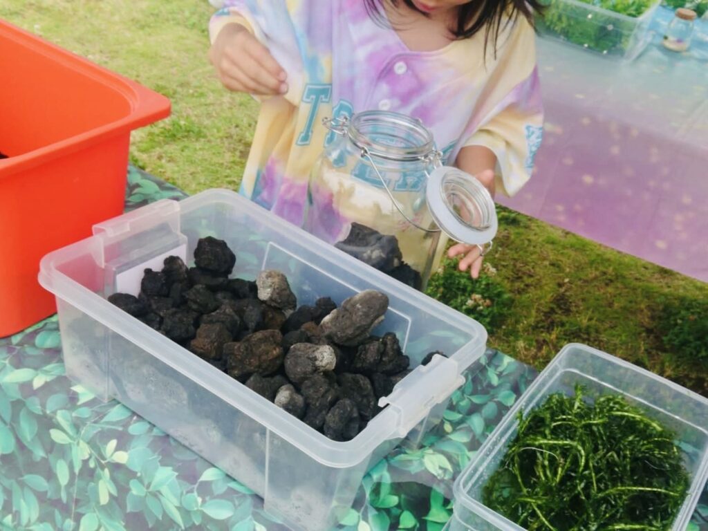 小さな瓶にサンゴ砂とお好きな飾りを入れてマリモの住む小さな世界づくりを体験していただきました。小さなまぁるいマリモがとても可愛らしかったです。