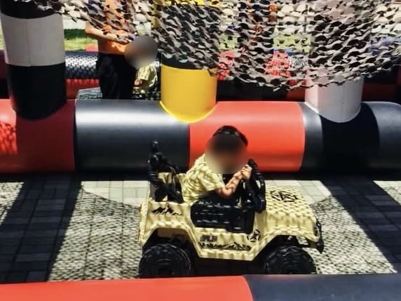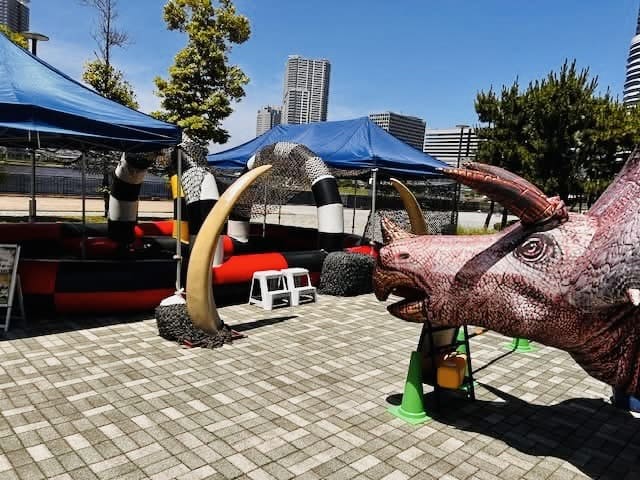 巨大な恐竜がいるコースをオフロードタイプのバッテリーカーで駆け回るイベントでした。暑い中、多くのお子さまに楽しんでいただけました。