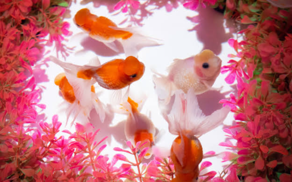 幻想的にライトアップされた水槽に約100匹の金魚が大集合!