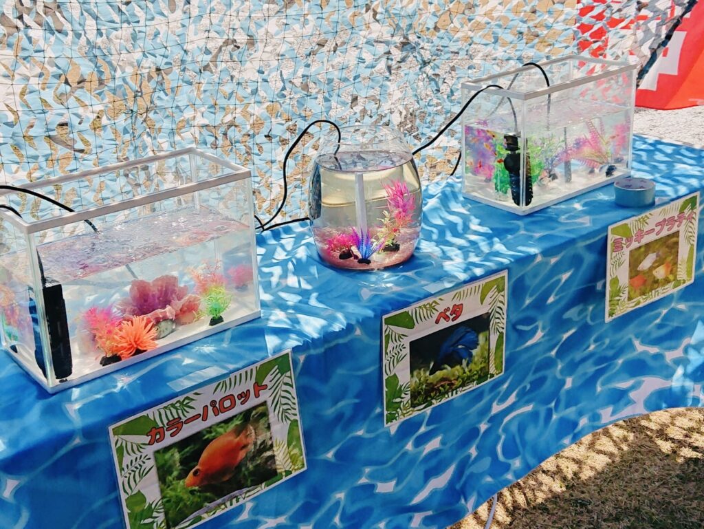 大きなくまさんの隣で “はい!チーズ!” とても可愛らしいお写真が撮れました。その他カラフルな生体展示やお菓子のプレゼントなどもありました。