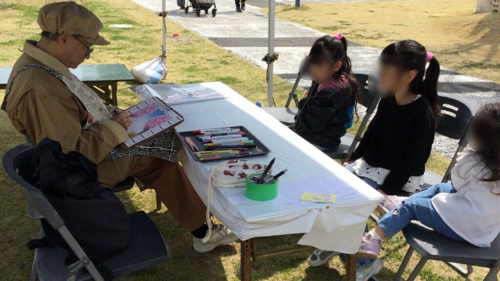 本日は『桜バックの似顔絵カレンダーサービス』と『ふわふわサファリバスで遊ぼう』を行いました。