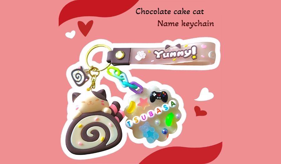チョコ色か桜色のにゃんこロールケーキを選んで、自分好みのネームタグを作って付けよう♪